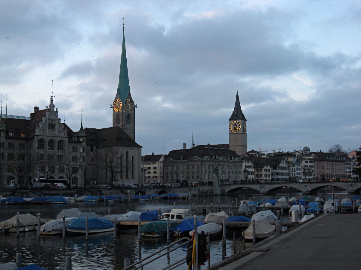 I campanili di Fraumünster e St. Peterskirche svettano sulla riva sinistra del Limmat, il fiume che attraversa il centro di Zurigo. Zurigo, 30 Dicembre 2013.