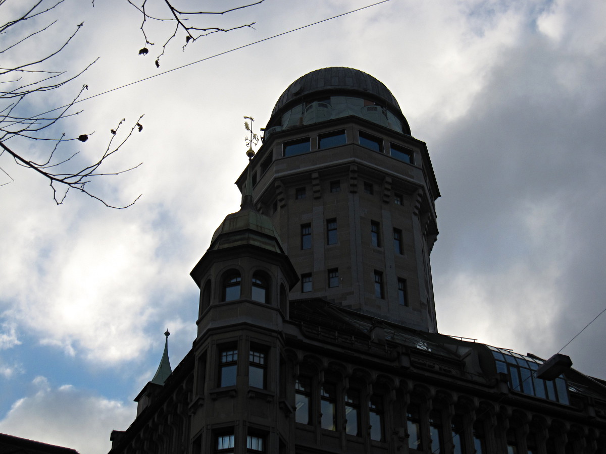 La grande cupola dell'Urania, l'osservatorio astronomico di Zurigo, emerge tra i palazzi della città. Zurigo, 30 Dicembre 2013.