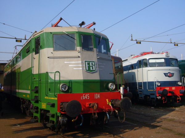 La E645.104 era in realtà nata come E646.004, ed è perciò una macchina di prima serie; negli ultimi anni di servizio le era stata applicata l'elaborata livrea grigio perla - verde magnolia che caratterizzava queste macchine allo stato d'origine. Da notare anche il fregio pentagonale delle FS sul muso. La locomotiva è preservata come materiale storico a Tirano.