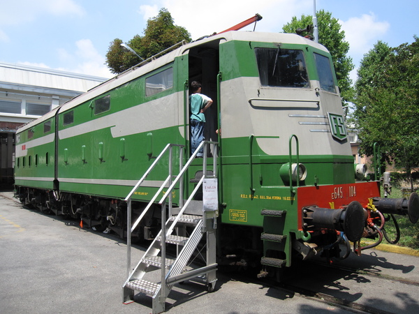 Nel piazzale tra l'officina media e l'officina piccola, al centro dell'impianto di Smistamento, troviamo l'unica locomotiva storica presente all'evento: la E645.104, una delle protagoniste del porte aperte di ottobre. Questa volta la locomotiva è visitabile, e ovviamente ne approfitto per salire in cabina.